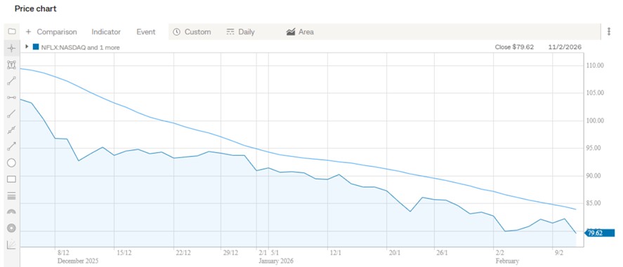The ongoing battle between Netflix and Paramount for custody of WBD certainly hasn’t gone unnoticed by the market. Netflix’s share price closed at just over US$100 on 5 December 2025; since then, it’s fallen by around 20% to land at US$79.62 on 11 February 2026.9